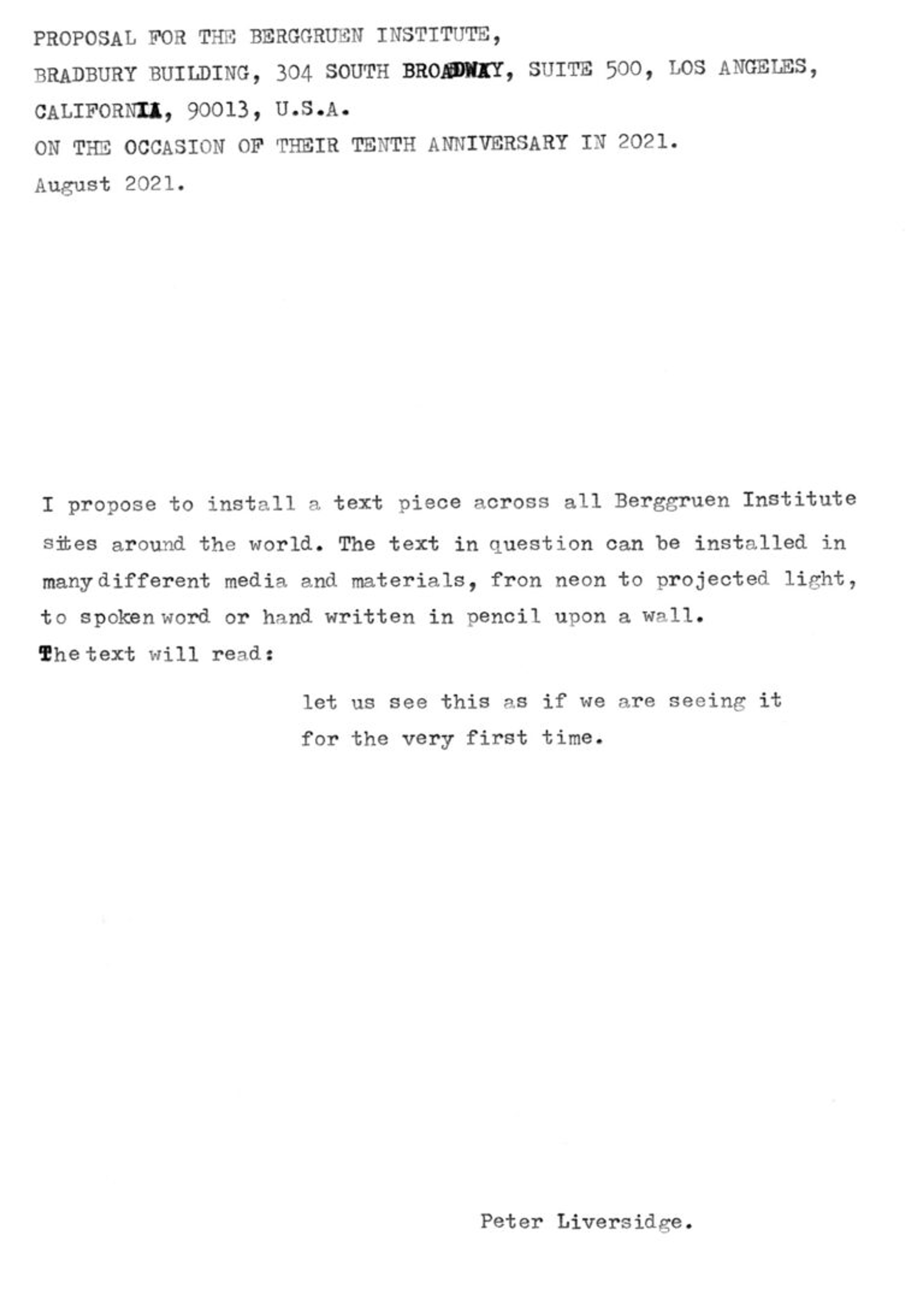Amidst a global pandemic, the Berggruen Institute invited artist Peter Liversidge—whose diverse oeuvre has a singular starting point of typewritten proposals—to reflect on the Berggruen Institute’s first decade and its role in the future.