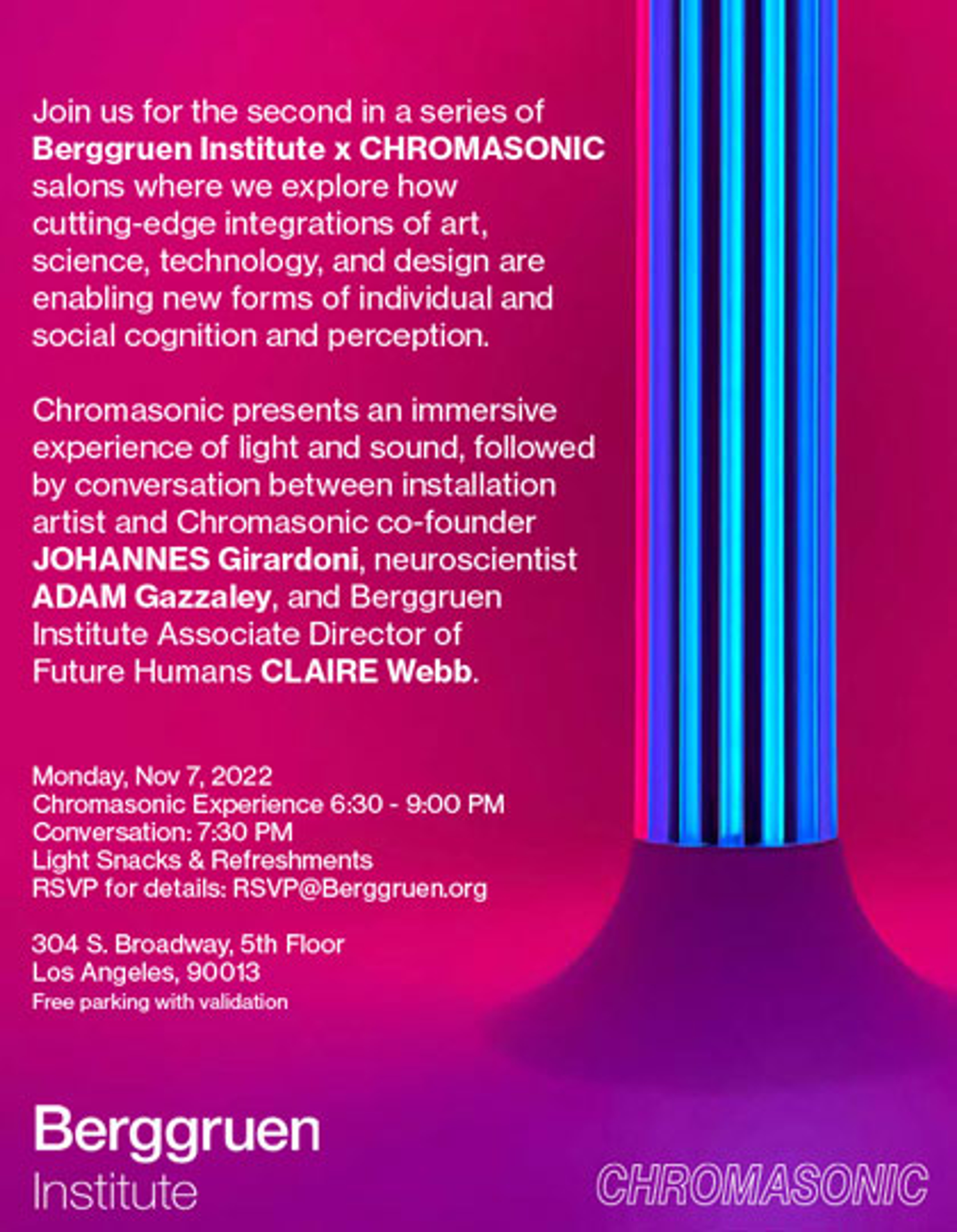 This Salon invites guests to experience the light and sound installation as a point of departure for a conversation between noted artist and Chromasonic co-founder Johannes Girardoni, leading neuroscientist Adam Gazzaley, and Associate Director of the Future Humans Theme Claire Isabel Webb. In the wide-ranging philosophical discussion, we will think together on how to stretch the potential of the human mind through new modalities of art and science.
