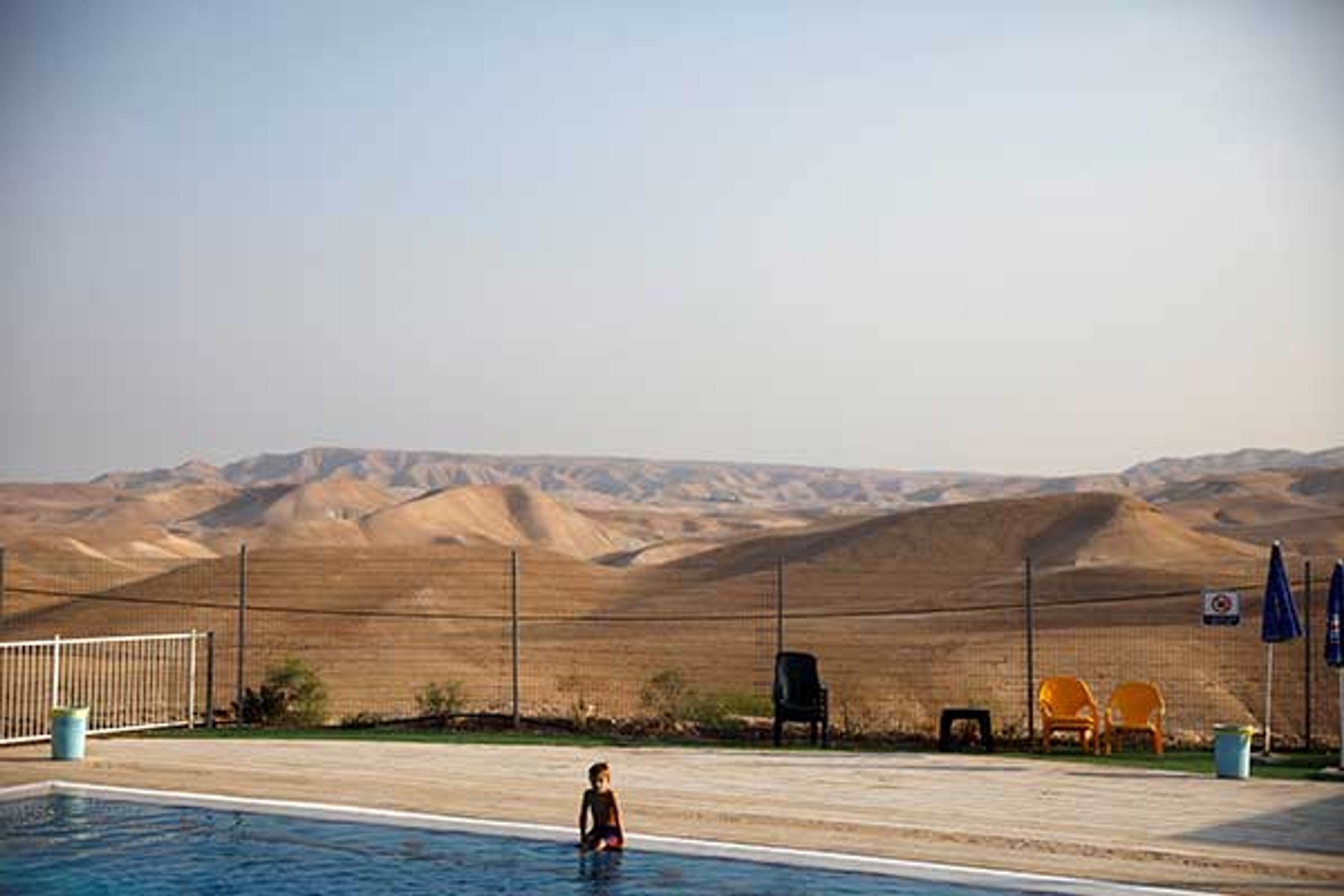 A boy sits by the swimming pool at the Israeli settlement of Vered Yericho in the occupied West Bank on Sept. 11, 2019. (Ronen Zvulun/Reuters)