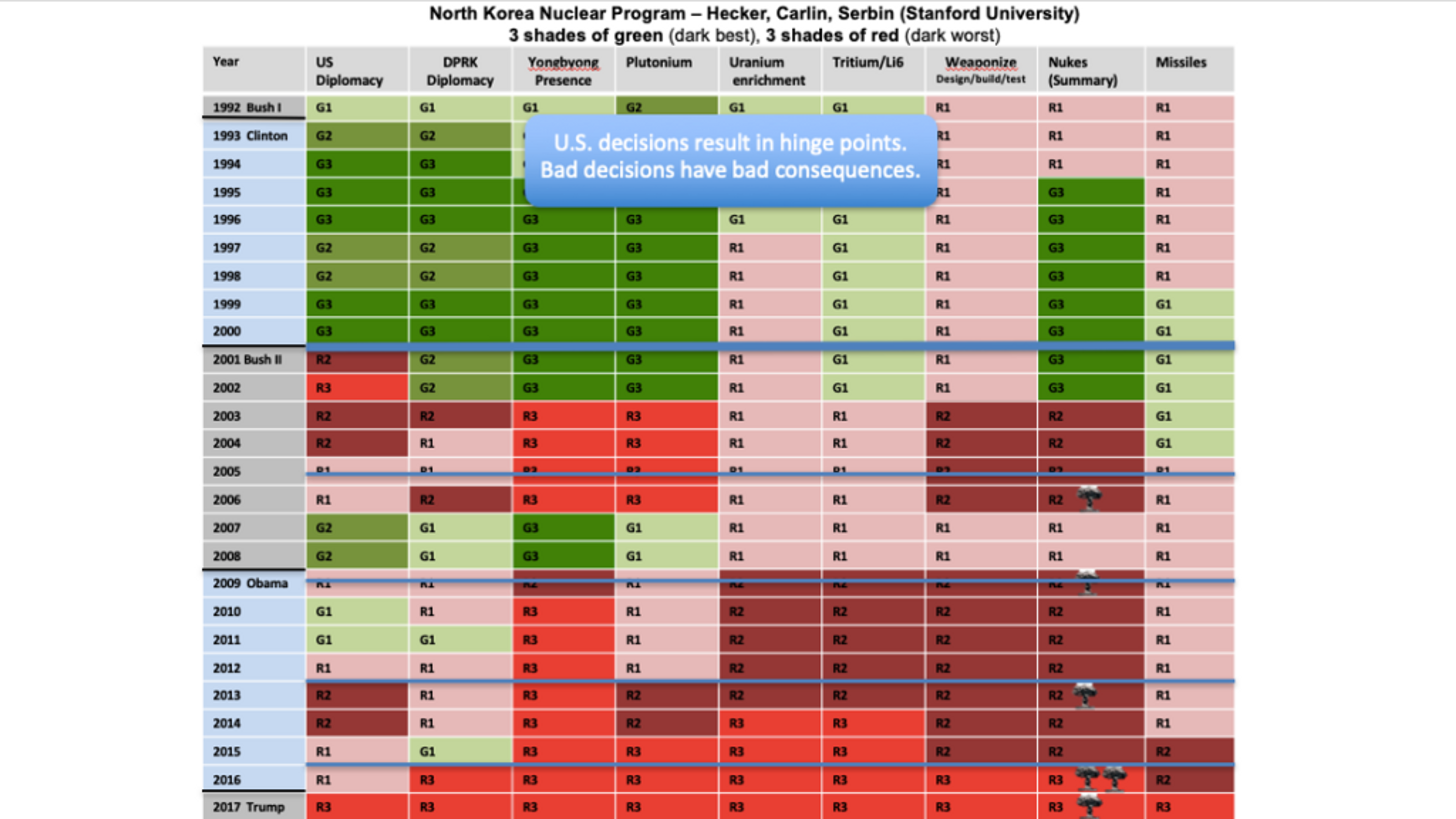 It is a hair-raising fact that since 2001, North Korea has gone from zero nuclear weapons to an arsenal that is likely between 30 and 60. The common wisdom is that the efforts by the George W. Bush and Barack Obama administrations to halt the North’s nuclear program through diplomacy or sanctions were circumvented by the North’s repeated violations of diplomatic agreements. There is another way of looking at the problem, however, and that is what we have described in a study as “hinge points” — moments when bad decisions had bad consequences for U.S. national security. We are teetering on the edge of another such hinge point, perhaps the most serious yet. For that reason, it’s well worth looking more closely at what is at risk, how not to repeat previous flawed decisions and what a path through this perilous moment might look like.